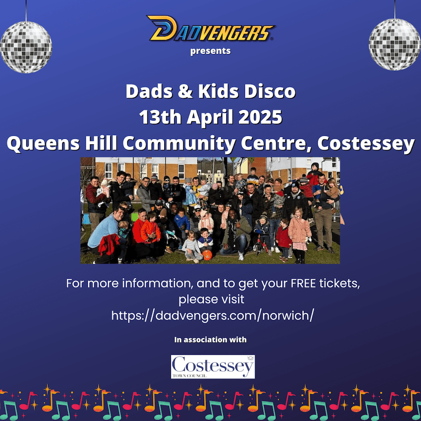 Dadvengers are delighted to announce that we will be hosting a FREE kids disco on the 13th April 2025 (10am – 12pm) in association with Costessey Town Council at the Queens Hill Community Centre.