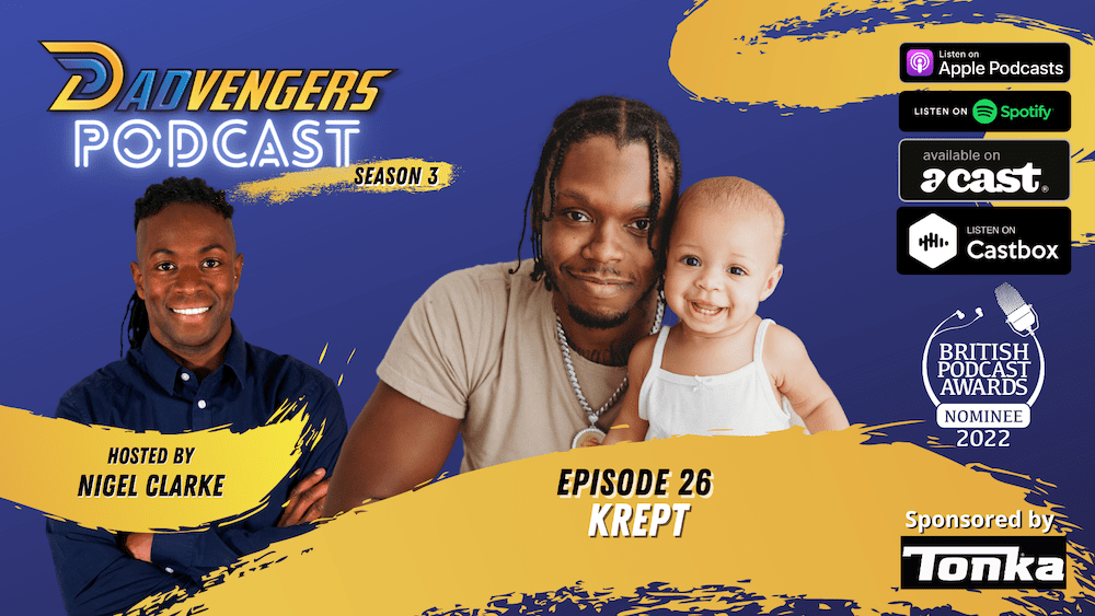 It’s the Dadvengers Podcast Episode 26- Krept. This week’s guest is a massive name in the UK hip-hop scene. He is also host of the BBC show The Rap Game UK, star of the BBC documentary “This Is England”. And has created his own baby skin care range named after his daughter. We are so pleased to welcome Casyo Johnson, aka Krept to the podcast!